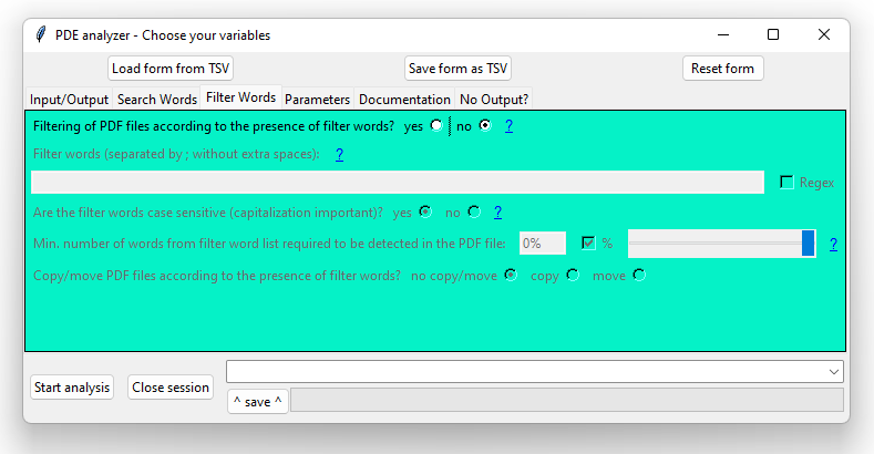 1. Choose what to extract: The PDE analyzer has 2 main functions A] PDF2TXT (extract sentences from pdf) and B] PDF2TABLE (table of PDF to excel file) which can be combined or executed separately. Each function can be combined with filters and search words. A file with the sentences carrying the search words will have the name format: [search words]txt+-[context][PDF file name] in the corresponding subfolder. Tables will be named: [PDF file name][number of table][table heading].