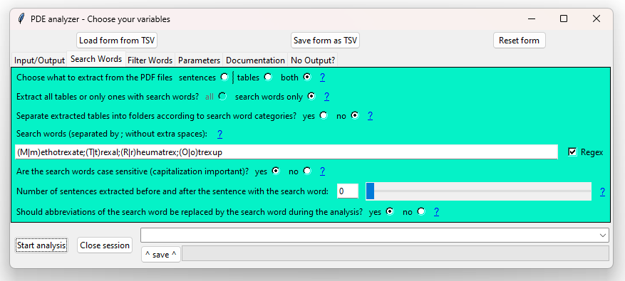 8. Evaluate abbreviations?: If “yes” was chosen, all abbreviations that were used in the PDF documents for the search words will be saved and then replace by abbreviation (search word)$*, e.g., MTX will be replaced by MTX (Methotrexate)$*. In addition plural of the abbreviations, i.e., the abbreviation with an “s” at the end will be replaced accordingly as well.