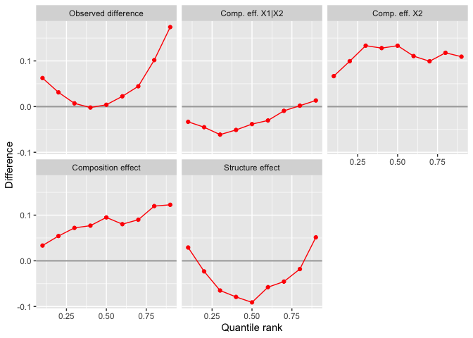 can be expressed in terms of \(P(g)\) and \(P(g|x)\), the (conditional) probabilities of belonging to group \(g\). This allows us to estimate the reweighting factor using sample probabilities of each group and fitting conditional probability models (e.g., logit) in the joint sample. The estimated factors are then used to estimate weighted distributional statistics of interest (e.g., mean, quantiles or Gini coefficient) in the reference sample – group 0 in the present example. The resulting counterfactual distributional statistic, \(\widehat\nu_C=\widehat\nu(F_{Y_C})\), is then contrasted with the observed difference \[\widehat\Delta_O^{\nu} = (\widehat\nu_1 - \widehat\nu_C) + (\widehat\nu_C - \widehat\nu_0) = \widehat\Delta_S^\nu + \widehat\Delta_X^\nu,\]