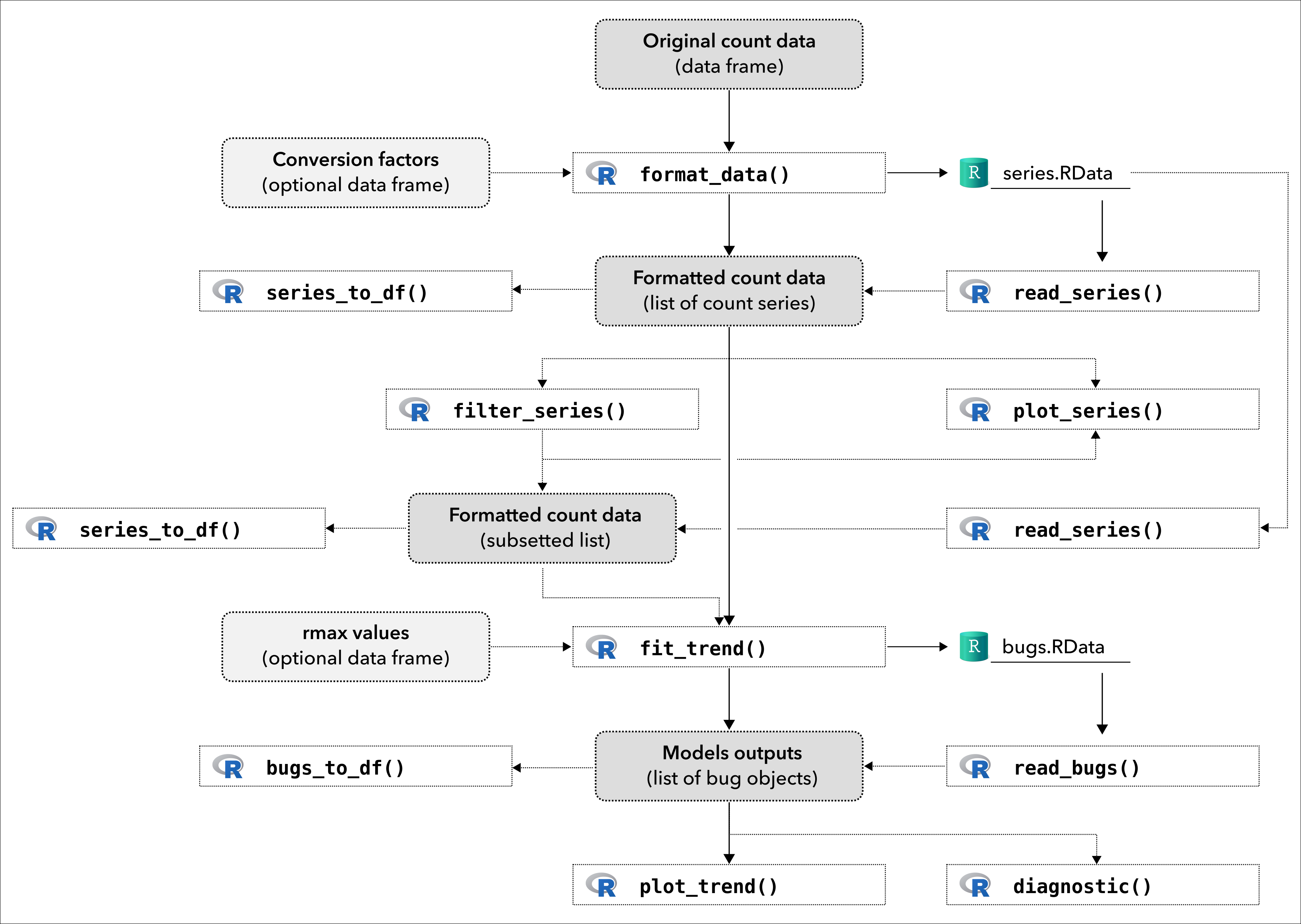 The goal of the R package popbayes is to infer trends of one or several populations over time from series of counts. It does so by accounting for count precision (provided or inferred based on expert knowledge, e.g. guesstimates), smoothing the population rate of increase over time, and accounting for the maximum demographic potential of species. Inference is carried out in a Bayesian framework. This work is part of the FRB-CESAB working group AfroBioDrivers.